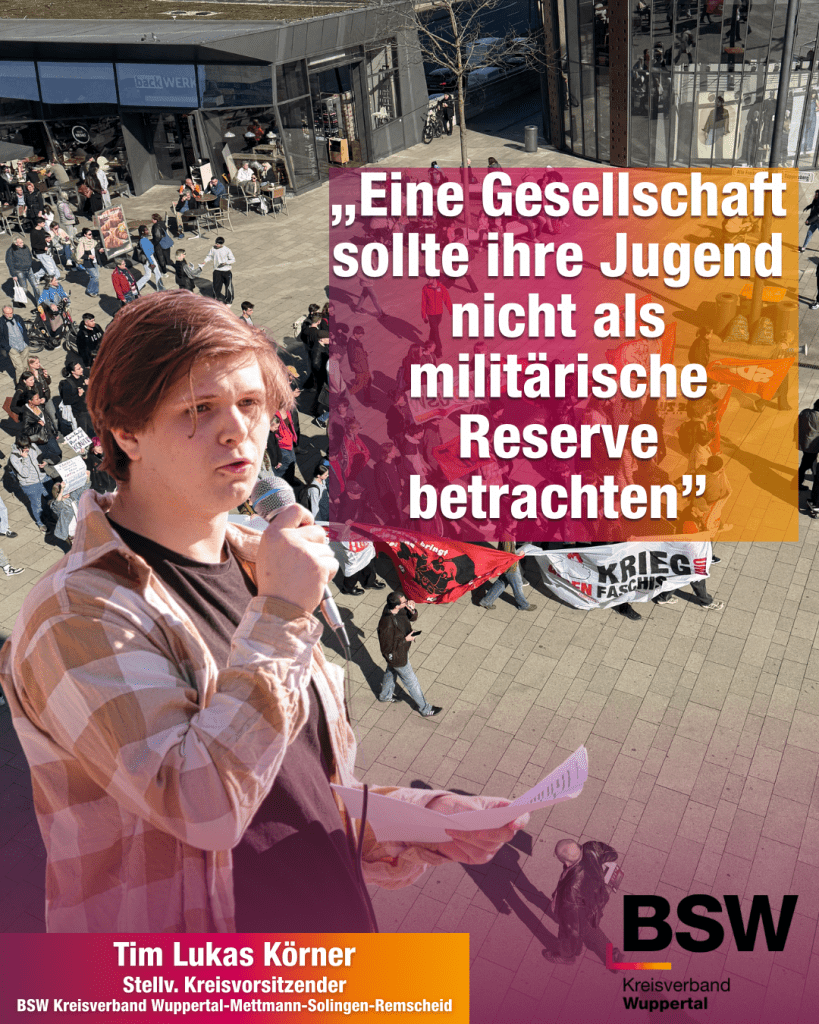 Bei der Kundgebung von „Nein zur Wehrpflicht“ sprach auch Tim Lukas Körner, stellvertretender Kreisvorsitzender des Bündnis Sahra Wagenknecht im Kreisverband Wuppertal-Mettmann-Solingen-Remscheid.